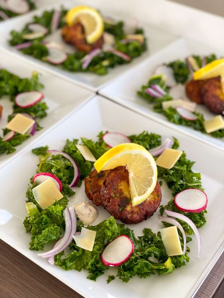 Maryland-style crab cakes on a classic Caesar salad with crouton crumbs, avocado & hard boiled egg
