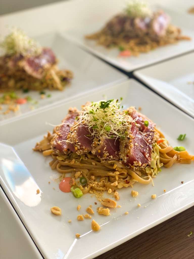 Fresh ceviche marinated in a coconut-lime dressing, served with plantain chips