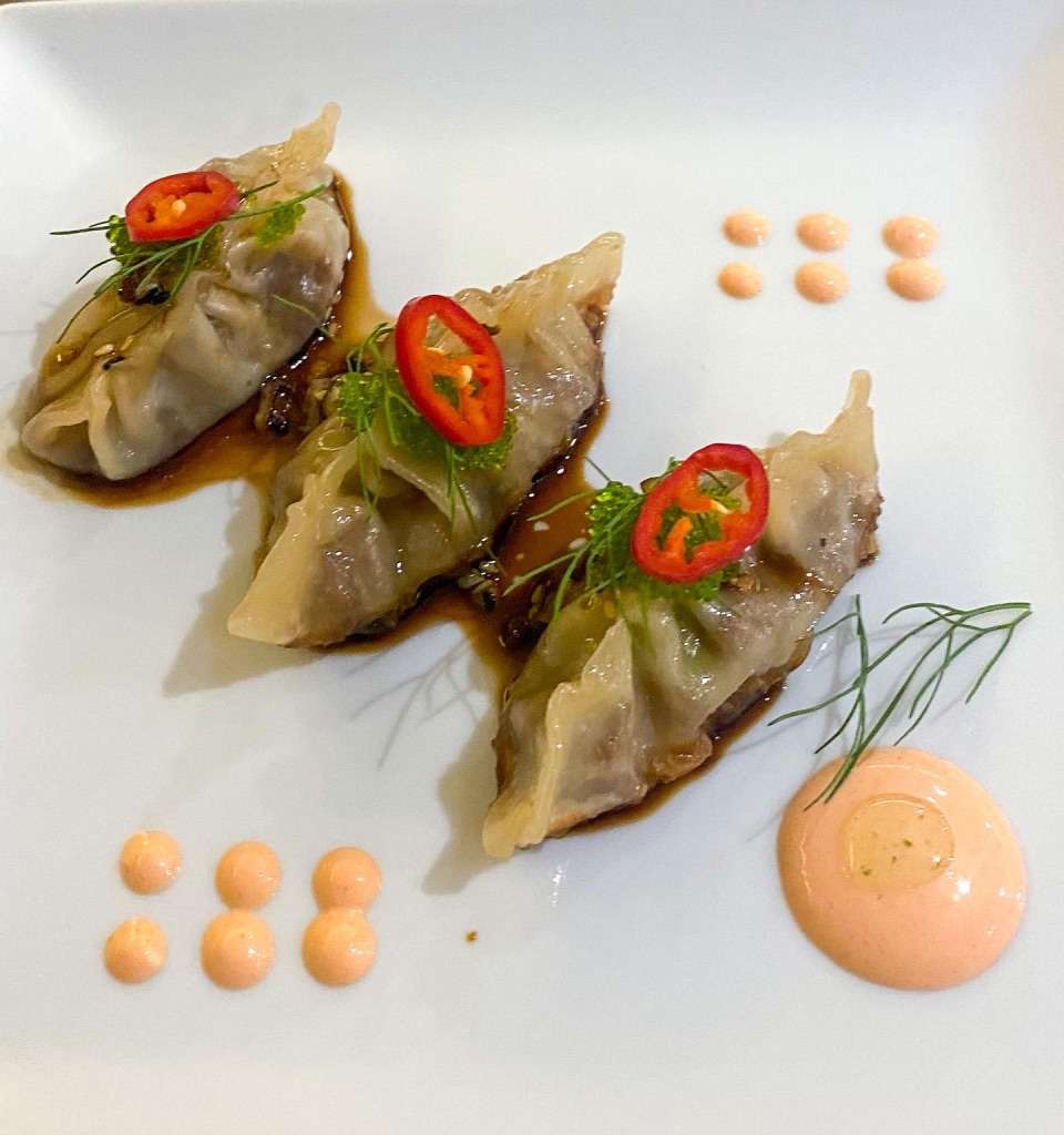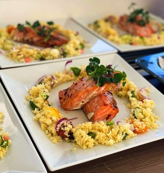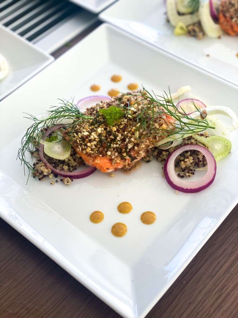 Pan fried local line-fish on top of crushed baby parsley potatoes with charred broccolini and a brown caper butter sauce