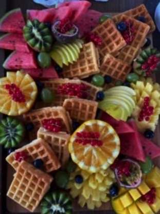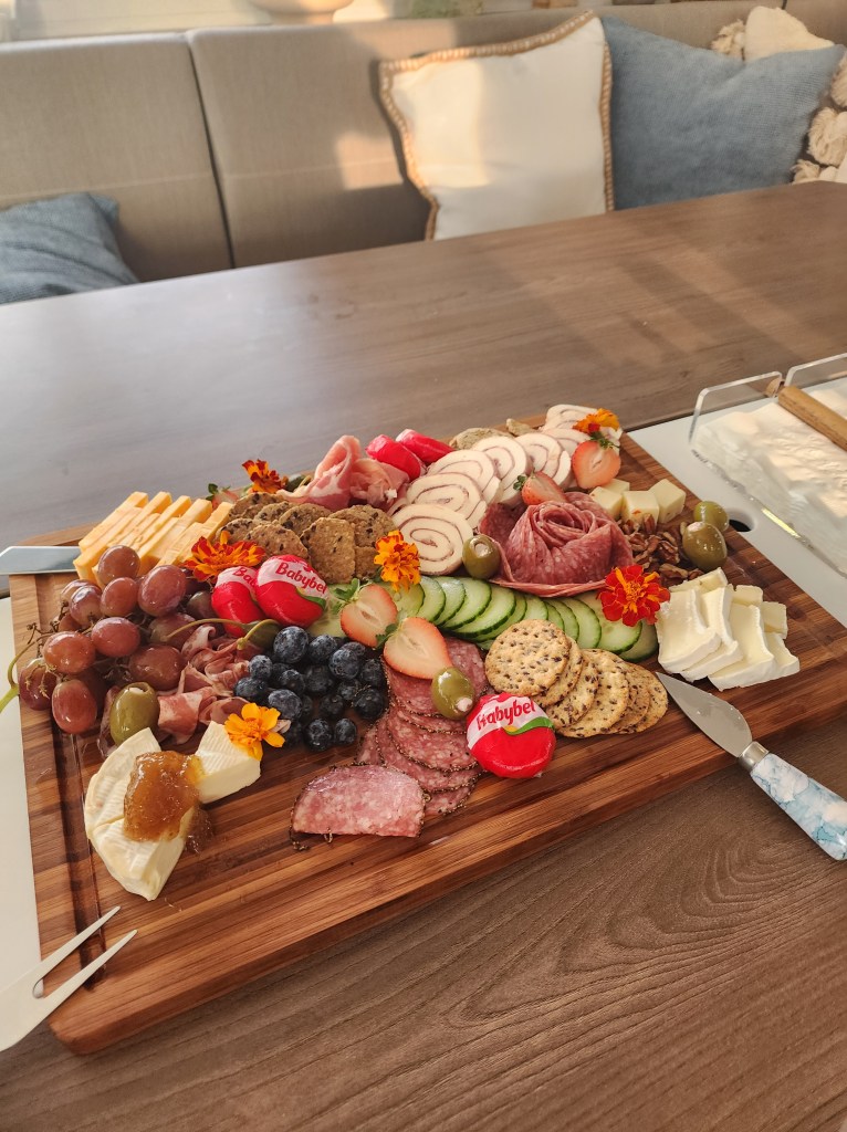 Cheese & charcuterie board with figs, berries, hot honey and wholewheat crackers