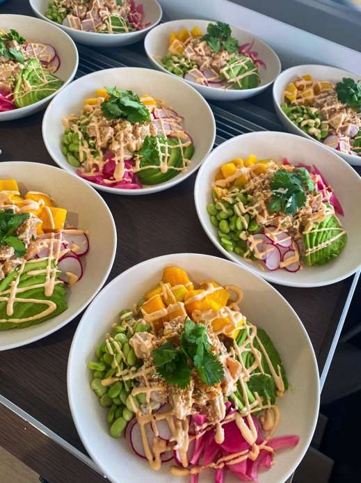Spicy sesame tuna poke bowls on sushi rice with furikake, wakame seaweed salad and avocado